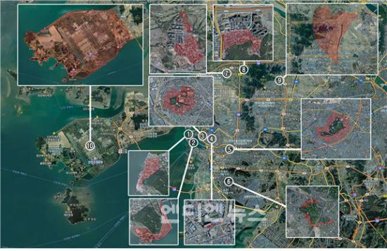 | 10 | - | 영종, 용유동 (인천공항 일원) | 75,877,000 | 해발 7~277m이하 | 인고 제248호 (1997.10.22.) |