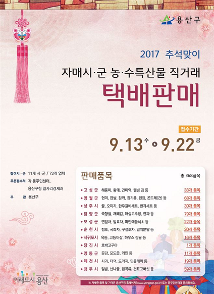 택배 판매는 13일부터 22일까지 진행된다. 죽향쌀, 황태 등 368종의 상품을 판매한다. 상품 구매를 원하는 주민은 용산구청 홈페이지(http://www.yongsan.go.kr) 또는 전단지에서 물품 종류와 가격을 확인하고 관할 동주민센터에 방문 또는 유선으로 신청하면 된다.
