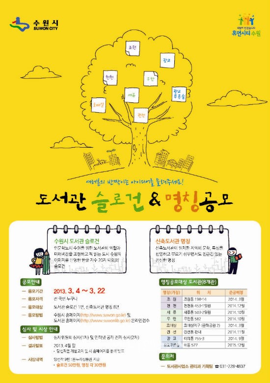 도서관 슬로건은 인문학도시 수원을 위한 도서관의 역할과 비전을 표현하고 책 읽는 도시 수원의 이미지를 반영해 한글 20자 내외로 응모하면 되고, 신축도서관 명칭은 도서관이 위치한 지역의 문화나 특성 등을 기준으로 부르기 쉬우면서도 친근감 있는 명칭을 응모하면 된다.