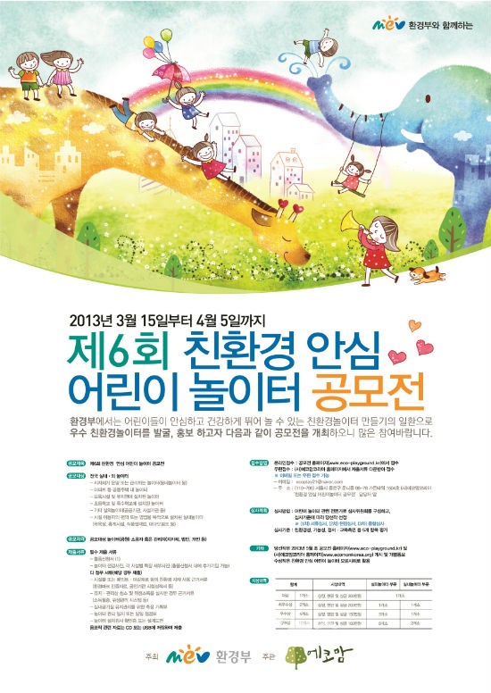 환경부에서는 (사)에코맘코리아가 주관하여 전국의 어린이 놀이터를 대상으로 어린이들이 안심하고 건강하게 뛰어 놀 수 있는 우수 친환경놀이터를 발굴·홍보하여 친환경 놀이터 조성에 대한 지자체 및 국민의 관심을 높이고자 ‘제6회 친환경 안심 어린이 놀이터 공모전’을 개최한다.