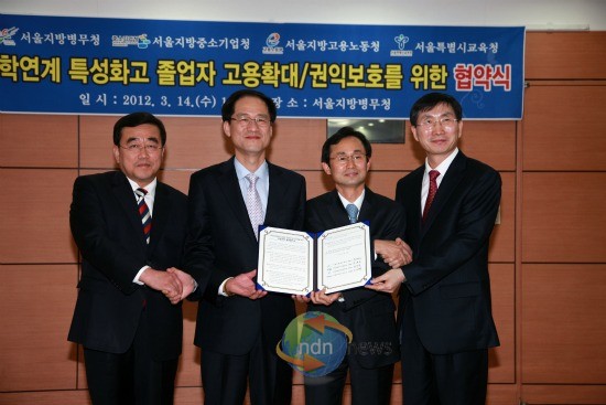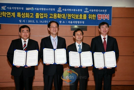 ▲ 사진 왼쪽부터 이대영 서울시교육청 부교육감, 임무송 서울지방고용노동청장, 문병민 서울지방병무청장, 김형호 서울지방중소기업청장이 산학연계 업무협약식 후 기념촬영하고 있다.서울특별시교육청 3월 14일 오후 2시서울지방병무청 대회의실에서 특성화고 졸업자 고용확대 및 권익보호를 위해 서울지방중소기업청, 서울지방고용노동청, 서울지방병무청장과 업무협약을 체결했다.▲ 사진 왼쪽부터 이대영 서울시교육청 부교육감, 임무송 서울지방고용노동청장, 문병민 서울지방병무청장, 김형호 서울지방중소기업청장이 산학연계 업무협약식 후 기념촬영하고 있다.
