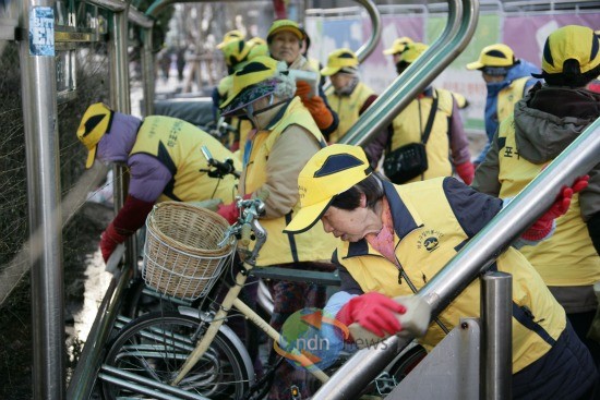 ▲ 박홍섭 마포구청장이 20일 아침, 서울 마포구 공덕역 주변에서 구민들과 함께 봄맞이 청소를 하고 있다.마포구는 20일 아침 마포대로변에서 박홍섭 마포구청장을 비롯 마포구들이 참석한 가운데 새봄맞이 대청소가 실시했다. ▲ 20일 아침, 마포구(구청장 박홍섭)가 구민과 함께하는 새봄맞이 대청소를 실시한 가운데, 마포구실버봉사단 어르신들이 자전거 보관소의 묵은 때를 닦아내고 있다.