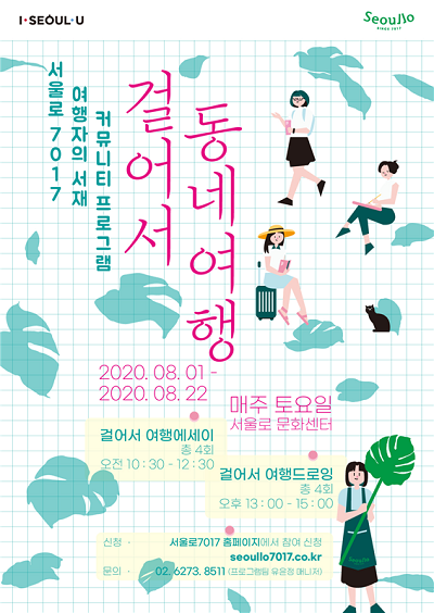 서울시는 서울로 7017 서울로문화센터에서 8월 1일부터 22일까지 매주 토요일 ‘여행자의 서재, 걸어서 동네여행’ 커뮤니티 프로그램을 개설하고, 도보여행을 주제로 한 ‘걸어서 여행에세이’, ‘걸어서 여행드로잉’ 강좌를 진행한다고 밝혔다.