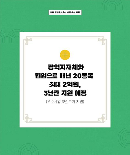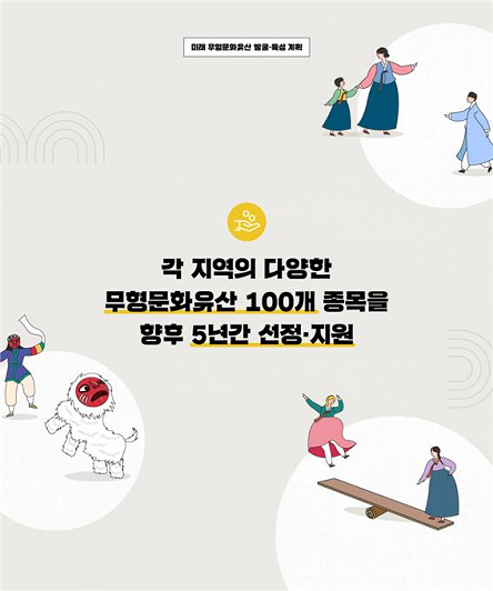 이에 문화재청은 각 지역 주민·전문가·지자체 등과 협력체계를 구축하여 각 지역의 대표 문화자원을 육성하고, 나아가 지역 정체성과 공동체가 강화되는 선순환구조를 구축하고자 미래 무형문화유산 발굴·육성 계획을 다음과 같이 추진한다. 우선, 문화재청은 2022년부터 5년간 매년 20종목 내외, 총 100종목을 선정하여, 조사·연구·교육 등 종목 보존‧활용을 위한 사업에 매년 최대 2억 원, 3년간 지원하고, 우수사업에는 최장 6년간 지원한다. 특히 2022년도는 공동체 약화로 소멸 위험이 큰 전통지식과 생활관습 등을 우선 지원하여 종목과 전승공동체가 활성화되도록 할 예정이다.