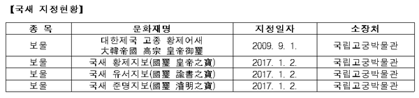 함께 지정된 ‘국새 제고지보’, ‘국새 칙명지보’, ‘국새 대원수보’는 모두 대한제국기(1897~1910)에 제작된 것으로, 한일강제병합이 이루어진 6개월 후인 1911년 3월 약탈되어 일본 궁내청(宮內廳)으로 들어간 수모를 겪기도 했다. 광복 후 1946년 8월 15일 미군정이 궁내청에서 환수해 총무처(1940~1960년대 국무총리 소속 아래 설치되었던 중앙행정기관)에 인계한 후 1954년 6월 28일 총무처가 국립중앙박물관으로 다시 인계하면서 오늘날까지 전해오고 있다.