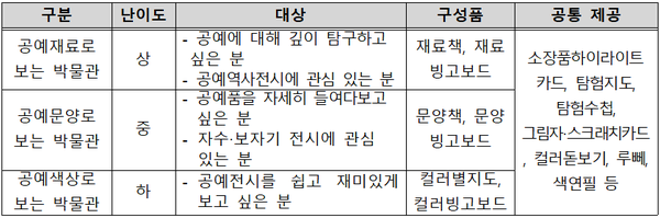 서울공예박물관에서 제작한 <SeMoCA 공예가방>은 3가지 종류로 공예재료로 보는 박물관(난이도 上), 공예문양으로 보는 박물관(난이도 中), 공예색상으로 보는 박물관(난이도 下)으로 박물관 소장품과 공예에 대한 이해를 중심으로 난이도별로 선택하여 체험할 수 있다. 이중 ‘공예 재료로 보는 박물관’ 에 담긴 공예 재료책에는 갓을 만드는 말총, 화각함을 만드는 소뿔로 만든 화각지, 나전칠기를 만드는 전복으로 만든 나전패 등 무형문화재 장인과 전수관에서 공수해온 귀한 재료를 직접 만져 볼 수 있게 작은 책으로 구성되어 있다. 또한 공예품과 공예재료를 연결하는 재료 빙고보드, 공예품 속 문양을 찾아보는 문양 빙고보드, 컬러별 소장품 찾기의 색상 빙고도브 등을 통해 전시실을 보다 신나고 재미있게 관람할 수 있다.