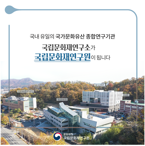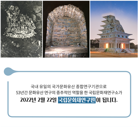 문화재청 국립문화재연구소(소장 지병목)가 2월 22일 국립문화재연구원으로 기관명을 변경한다. 국립문화재연구원(이하 연구원)은 1969년 11월 5일 문화재관리국 ‘문화재연구실’로 설치된 이후, 1995년 11월 22일 ‘국립문화재연구소’로 명칭을 변경하였다. 연구소는 최근 4차 산업혁명의 도래로 인공지능(AI), 3차원 입체 데이터, 비접촉 분석 활용, 다양한 문화유산 지식자원을 바탕으로 한 융・복합 연구, 체계적이고 과학적인 문화재 분석연구 등 환경 변화와 수요에 선제적으로 대응하고자 기관명을 ‘연구원’으로 변경하게 되었다.