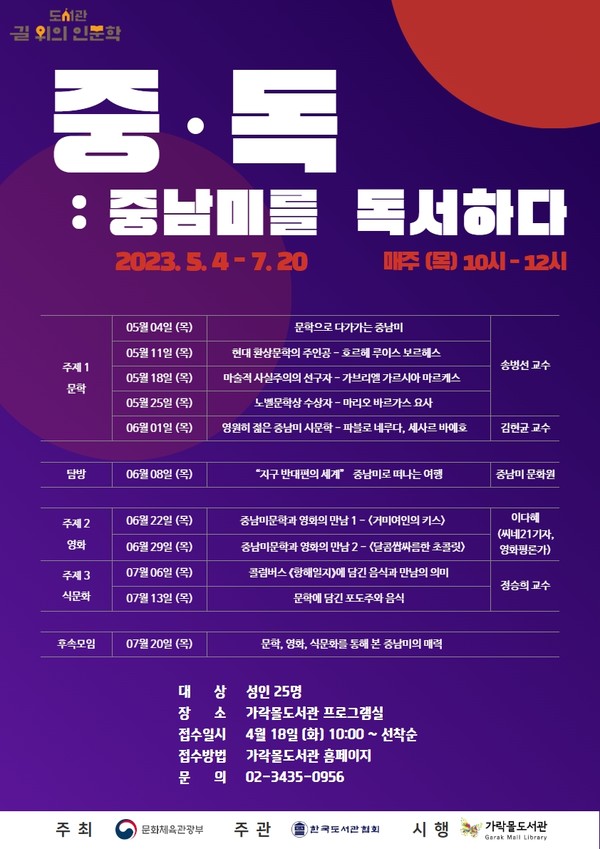 [서울시티=김청월 기자] 가락몰도서관(서울시농수산식품공사, 사장 문영표)에서는 지난 5월 4일부터 7월 27일까지 11회(매주 목요일)에 걸쳐 ‘중남미를 독(讀)서하다’라는 인문학 프로그램을 진행하였다. 무덥고 지루한 장마 속에서도 총인원 330명이 넘는 사람들의 많은 참여와 관심 속에서 성황리에 진행된 이 사업은 문화체육관광부에서 공모한 2023년도 도서관 ‘길 위의 인문학’ 사업의 일환으로 일반 성인을 대상으로 한 인문학 프로그램이다.