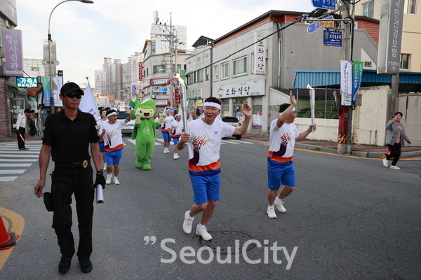 [서울시티 김정훈 기자]12일 제104회 전국체전 성공을 기원하는 성화 봉송을 김철우 군수와 보성군 특산품 캐릭터인 녹차몬이 함께하고 있다./보성군 제공