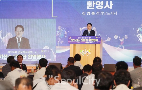 [서울시티 김정훈 기자]김영록 전라남도지사가 12일 오후 목포 신안비치호텔에서 열린 제104회 전국체육대회 참가선수 대표단 환영 행사에서 환영사를 하고 있다./전남도 제공