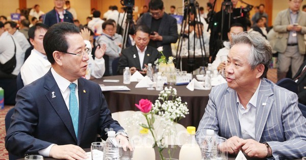 김영록 전라남도지사가 12일 오후 목포 신안비치호텔에서 열린 제104회 전국체육대회 참가선수 대표단 환영 행사에서 이기흥 대한체육회장과 이야기를 나누고 있다.