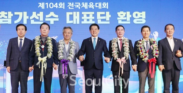 김영록 전라남도지사와 이기흥 대한체육회장 등 내빈들이 12일 오후 목포 신안비치호텔에서 열린 제104회 전국체육대회 참가선수 대표단 환영 행사에서 기념촬영을 하고 있다.
