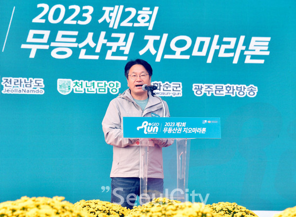 강기정 광주광역시장이 15일 오전 전남 화순군 금호화순스파리조트에서 무등산권 유네스코 세계지질공원 인증 5주년을 기념해 열린 '제2회 무등산권 지오 마라톤대회'에 참석해 축사를 하고 있다./광주광역시 제공