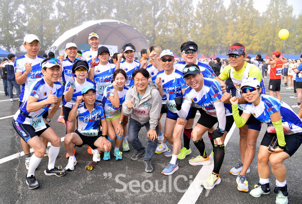 강기정 광주광역시장이 15일 오전 전남 화순군 금호화순스파리조트에서 무등산권 유네스코 세계지질공원 인증 5주년을 기념해 열린 '제2회 무등산권 지오 마라톤대회'에 참석해 대회 참가 선수들과 기념촬영을 하고 있다./광주광역시 제공