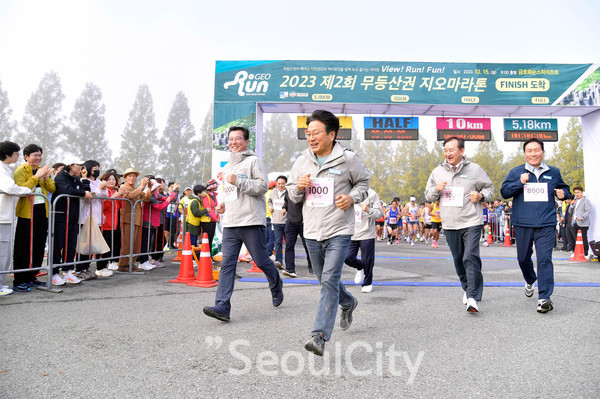 강기정 광주광역시장이 15일 오전 전남 화순군 금호화순스파리조트에서 무등산권 유네스코 세계지질공원 인증 5주년을 기념해 열린 '제2회 무등산권 지오 마라톤대회'에 참석해 정찬균 전남도 동부지역본부장, 이병노 담양군수, 강종철 화순군 부군수 등과 5.18㎞ 구간을 힘차게 출발하고 있다./광주광역시 제공