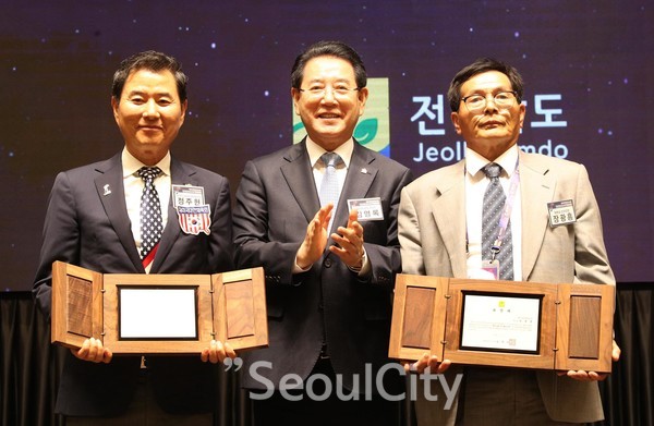 [서울시티 김정훈 기자]김영록 전라남도지사가 16일 오후 무안군 삼향읍 스카이웨딩컨벤션홀에서 열린 제104회 전국체전 해외동포선수단 환영만찬에서 도지사 표창패를 수여한 뒤 기념촬영을 하고 있다. (왼쪽부터)세계한인체육회 총연합회 정주현 회장, 김영록 전라남도지사, 재독일대한체육회 장광흥 회장/전남도 제공