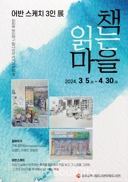 [서울시티 김정훈 기자]광주광역시무등도서관은 오는 4월 말까지 어반스케치 3인전 ‘책 읽는 마을 전시회’를 개최한다고 밝혔다.