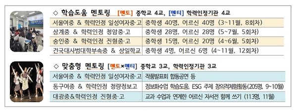 또한 청소년 멘토 역량을 높이기 위해 중 2,3학년을 우선 선발하고, 운영기간을 작년 한학기(2학기만 운영)에서 올해 1년(1,2학기 운영)으로 확대하였다. 27일(토)에는 조희연 교육감이 서울여중과 학력인정 일성여자중고를 방문하여 학생들을 격려하고, 세대 배움동행을 응원한다.