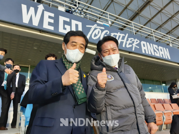 [NDNnews=수도권] 황장하 기자= 6일 오후 7시 안산 와~스타디움에서 열린 하나원큐 K리그2 2022 9라운드 경기에 안산FC 구단주 윤화섭시장과 안양FC구단주 최대호시장이 서로의 승리를 기원하면서 환하게 웃고 있다.