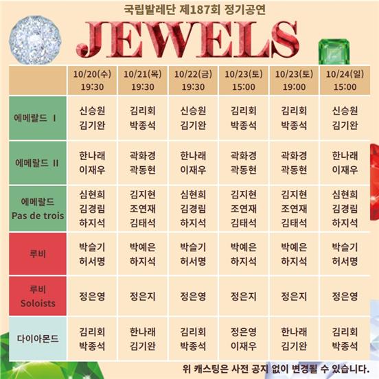 에메랄드(신승원-김기완), (김리회-박종석) / 루비(박슬기-허서명), (박예은-하지석) / 다이아몬드(김리회-박종석), (한나래-김기완), (정은영-이재우) 등 각 막별 주역들이 어떤 모습으로 반짝이는 보석을 표현하게 될지 귀추가 주목된다.