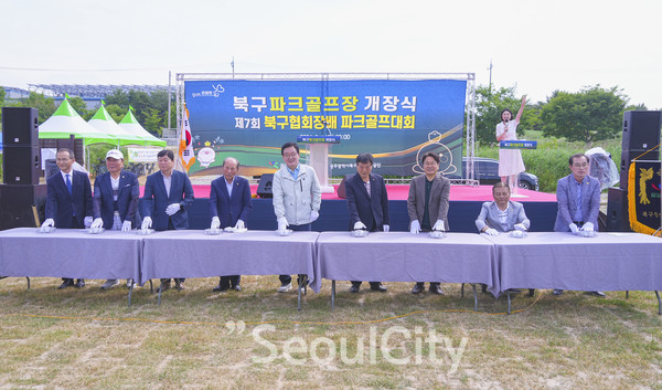 [서울시티 김정훈 기자]강기정 광주광역시장(오른 쪽부터 세 번째)이 지난 1일 오전 북구 연제동 '북구파크골프장 개장식'에 참석해 문인 북구청장 등 내빈들과 개장 퍼포먼스를 하고 있다./광주광역시 제공