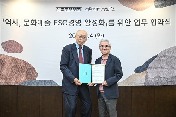 [서울시티=김청월 기자] 세종문화회관(사장 안호상)과 세종국가경영연구원(이사장 손욱)은 6월 4일(화) 역사교육과 문화예술 부문에서 ESG 활동을 적극 펼치기 위한 업무협약을 체결했다. 세종문화회관 안호상 사장과 세종국가경영연구원 손욱 이사장이 참석한 협약식은 문화예술분야에서의 ESG경영 확대에 대한 의지를 다지는 계기가 되었다. 세종문화회관은 2022년부터 ESG경영을 선도적으로 도입하여 다양한 활동을 펼치고 있다. 특히 세종문화회관은 상설 전시장 세종이야기에서 세종국가경영연구원과 함께 <내가 그린 세종 어진>, <내가 만난 세종 : 저자가 말하는 세종 이야기> 등 청소년과 시민이 참여하는 ESG경영 프로그램을 운영하고 있다. 앞으로 세종문화회관은 세종대왕의 성장과정 및 문제해결 방식 등을 배울 수 있는 프로그램을 통해 학생과 직장인 등 과도 적극 소통하며 세종대왕의 애민사상을 널리 알리는데 힘쓸 예정이다.