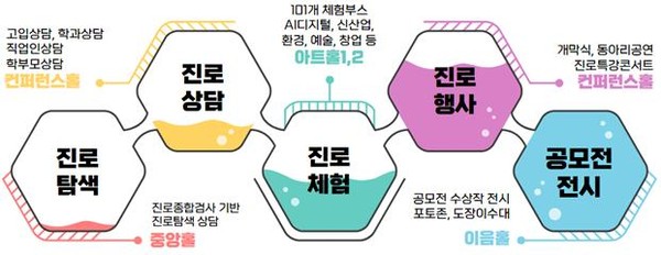 진로행사관에서는 서울 관내 초·중·고 학생 공연 동아리 21개팀의 무대가 펼쳐지며, 진로특강에서는 과학수사, 동물복지, 경영, 예술 등과 관련된 연사 5명이 학생·청소년·학부모에게 그들의 삶과 미래 진로역량에 관한 이야기를 들려준다.
