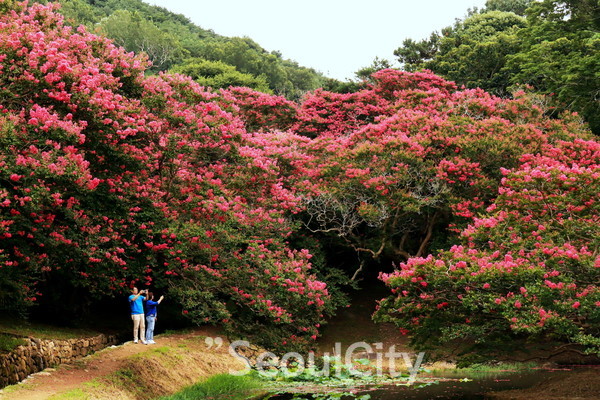 [서울시티 김정훈 기자]전남 담양에 위치한 명승 제58호 명옥헌원림에 백일홍이 절정을 이루며 불볕더위에도 관광객과 사진 애호가들의 눈길을 사로잡고 있다.