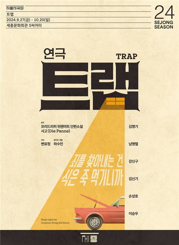 [서울시티=김청월 기자] 세종문화회관(사장 안호상)은 서울시극단(단장 고선웅)의 하반기 첫 작품으로 스위스 작가 프리드리히 뒤렌마트의 단편소설 <사고>(Die Panne)를 원작으로 한 <트랩>을 9월 27일부터 10월 20일까지 세종문화회관 S씨어터에서 선보인다.