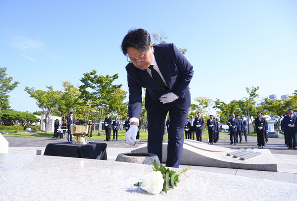 강기정 광주광역시장이 제79주년 광복절을 맞아 15일 오전 서구 상무시민공원 광주독립운동기념탑에 헌화와 분향을 하고 있다./광주광역시 제공
