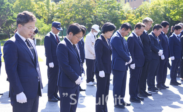 강기정 광주광역시장이 제79주년 광복절을 맞아 15일 오전 서구 상무시민공원 광주독립운동기념탑에 묵념을 하고 있다./광주광역시 제공