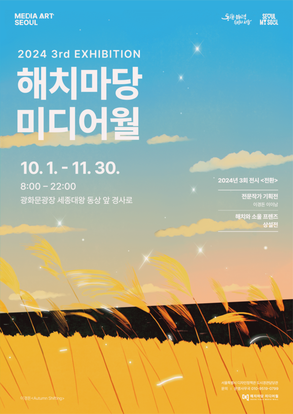 올해 세 번째로 진행되는 이번 전시는 가을의 문턱에서 계절의 <전환>을 풀어낸 작품을 선보이며 ▲전문작가 기획전, ▲해치와 소울 프렌즈 상설전이 오전 8시~저녁 22시까지 순차적으로 상영된다.