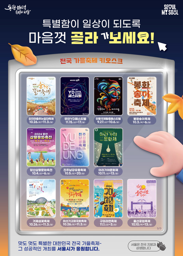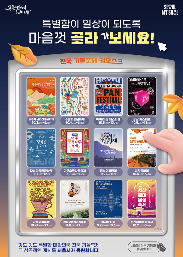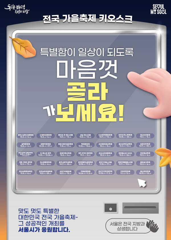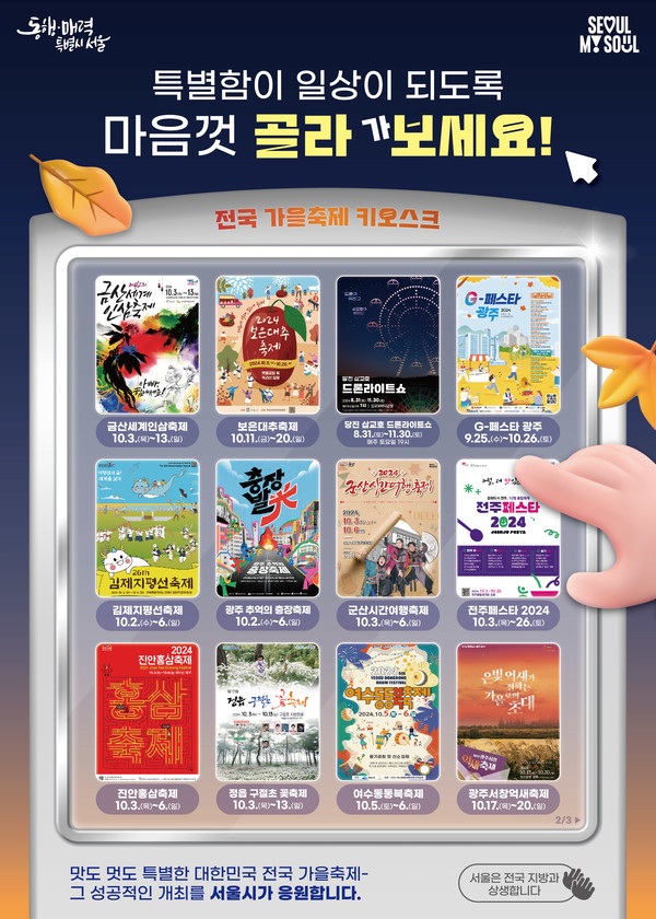 [서울시티=선정진 기자] 서울시는 10월~11월 전국에서 개최되는 가을축제를 한눈에 살펴볼 수 있는 ‘서울과 지방이 함께하는 상생홍보 - 가을축제편’ 기획 홍보물을 제작해 시민에게 선보인다고 밝혔다.