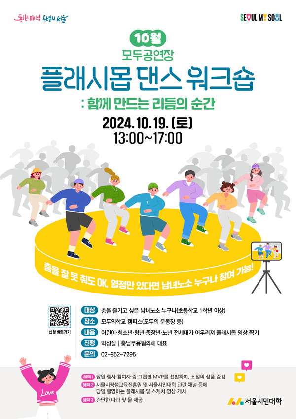 [서울시티=선정진 기자] 서울시평생교육진흥원이 운영하는 서울시민대학 모두의학교 캠퍼스(서울시 금천구)에서 오는 19일, 남녀노소 누구나 참여할 수 있는 특별한 플래시몹 댄스 워크숍이 열린다.