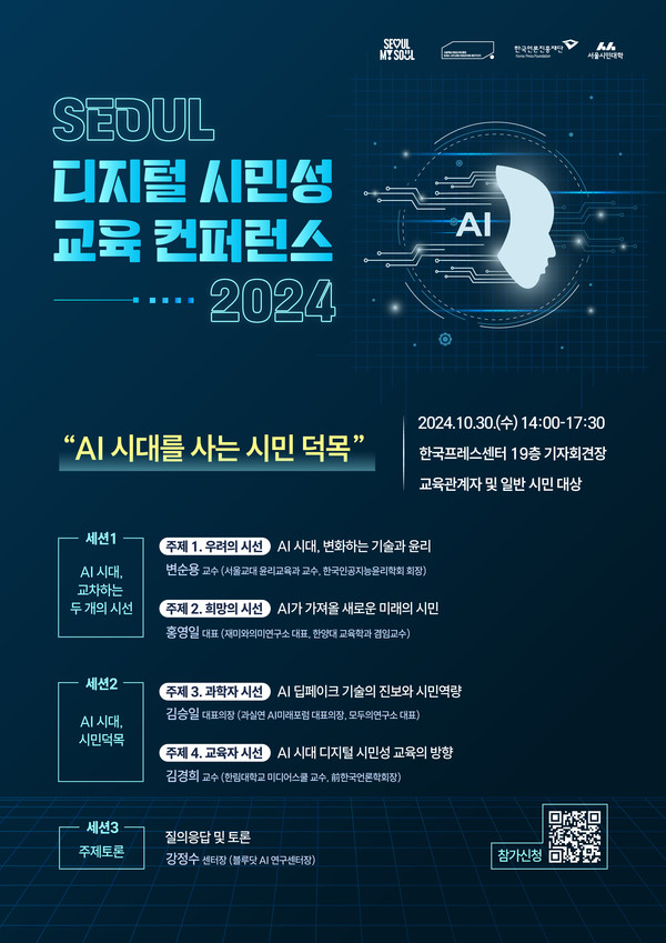 [서울시티=선정진 기자] 서울시평생교육진흥원(원장 한용진)은 오는 10월 30일(수) 한국프레스센터 19층 기자회견장에서 ‘2024 서울 디지털 시민성 교육 콘퍼런스’를 개최한다. 이번 콘퍼런스는 디지털 미디어 환경에서 시민들이 갖춰야 할 역량을 논의하고, AI 시대에 필요한 시민의 덕목을 탐구하는 중요한 자리로 기대를 모으고 있다.