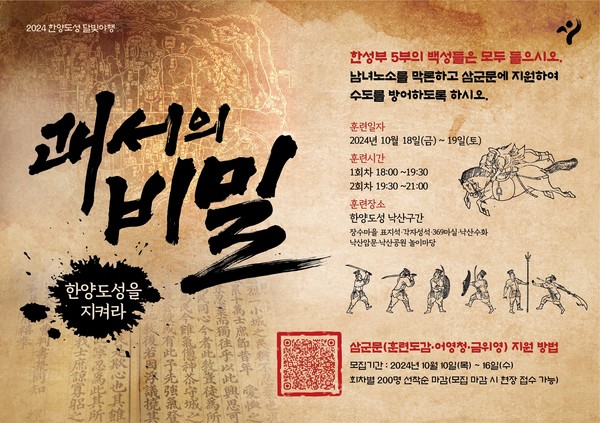 올해 주제인 ‘괘서의 비밀 – 한양도성을 지켜라’는 시민들이 직접 조선의 삼군영(훈련도감, 어영청, 금위영)의 정예요원이 되기 위한 훈련 임무를 통과하는 콘셉트로 진행된다. 각 임무 단계별 난이도가 달라 더욱 흥미롭게 과제에 참여할 수 있을 예정이다. 행사는 혜화문 맞은편에서 시작되는 한양도성 낙산구간(369마실~각자성석~장수마을 표지석~낙산암문~낙산공원 놀이마당) 일대에서 진행된다. 일자별로 1회차(18시) 2회차 (19시 30분)으로 나뉘어 총 4회 운영 예정이다.