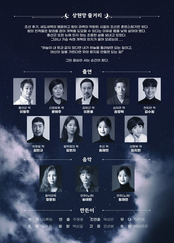 공연은 총 12명의 배우가 출연한다. 흥선대원군 역은 배우 이형주, 신정왕후역은 배우 문혜주가 맡았다. 특히 극중에서 연주되는 창작곡 ‘상현망’을 주목할 만 하다. 거문고, 꽹과리, 취타대 나발 등 우리 전통 음악과 민자방울, 종, 핸드벨, 티벳 종 등 이국적인 타악기의 선율을 더하여 흥선군의 심리를 묘사한다. 또한 극을 해설해주는 소리꾼(전기수) 역할의 ‘얼럭광대’의 노랫가락과 배우들의 춤사위 등을 통해 세상을 바꾸고자 하는 흥선대원군의 의지와 이를 둘러싼 복잡한 심경들을 담아냈다.