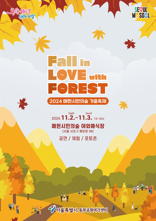 [서울시티=선정진 기자] 서울시는 매헌시민의숲에서 다양한 음악회를 만날 수 있는 가을축제 ‘Fall in love with forest’를 11월 2일(토)~3일(일) 오후 1시~6시까지 진행한다.