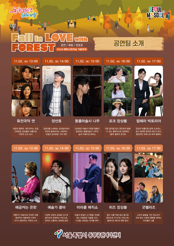 11월 3일(일)에는 전통악기 해금으로 친숙한 곡을 연주하는 ’해금켜는 은한‘, 다양한 감정과 공감을 음악으로 표현하는 아티스트 ’예술가 콤마‘, 신비로운 마술로 시선을 사로잡는 ’미라클 매직쇼‘, 클래식과 재즈의 흥겨운 매력 ’히즈 앙상블‘, 듣는 이에게 행복을 전하는 아카펠라 그룹 ’굿펠라즈‘의 공연이 아름다운 가을숲을 배경으로 준비되어 있다.