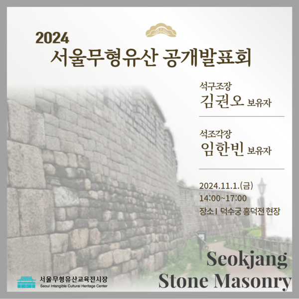 ‘석장’은 석조물을 제작하는 기술과 그 기능을 지닌 장인을 말한다. 조선의 수도 한양을 조성하는 과정에서 축성(성 쌓기), 석물 제작이 필수였기에 석장의 기술도 자연스럽게 발전해왔다. ‘서울석장’ 공개시연은 ‘석구조장’ 김권오 보유자와 ‘석조각장’ 임한빈 보유자가 참여하여 전통 방식의 ‘석재 다듬기’와 ‘석 조각’ 과정을 선보인다. 11.1.(금) 오후 2시, 덕수궁 흥덕전 복원현장에서 개최된다.