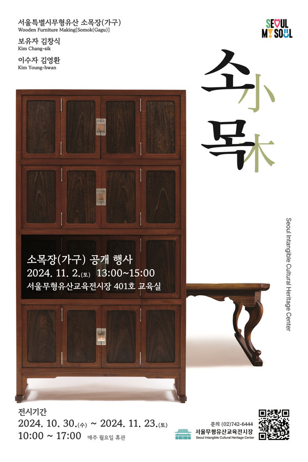 ‘소목장’은 건물의 문이나 창문, 장롱, 궤 등의 목가구를 제작하는 기술과 그 기능을 지닌 장인을 말한다. 이번 시연에는 ‘소목장’ 김창식 보유자가 참여하여 목가구 제작 기술을 선보인다. 시연은 11.2.(토) 서울무형유산 교육전시장에서 개최된다. 한편, 10.30.(수)부터 11.23.(토)까지 각종 전통 소목 가구도 전시한다.