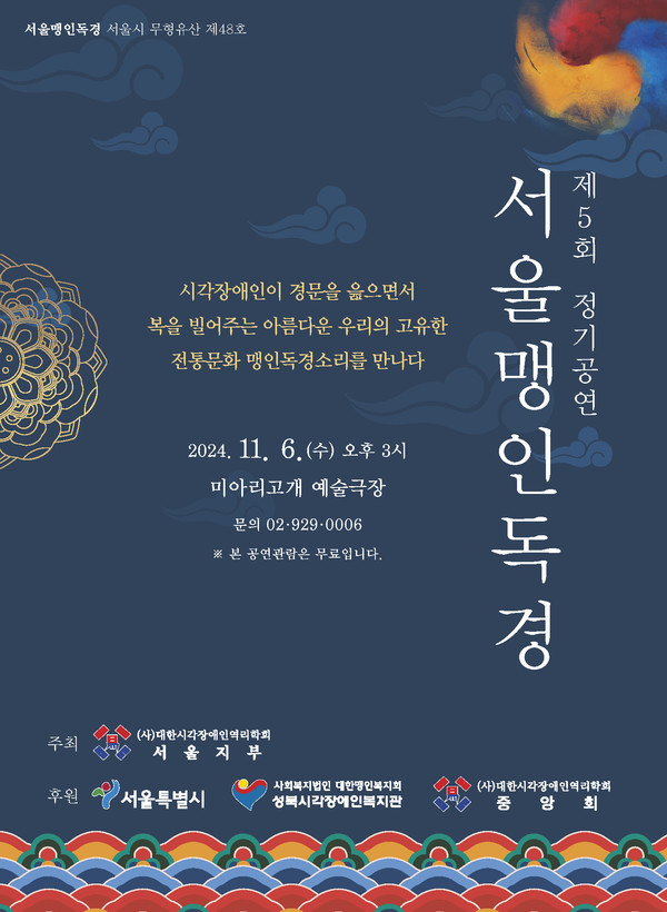 ‘서울맹인독경(盲人讀經)’은 조선시대부터 전해오는 의례로 맹인이 경문(經文)을 읽으며 신에게 재앙을 물리치고 복을 비는 것을 말한다. 특히 서울 지역에서 행해지던 ‘맹인독경’은 다른 지역과 달리 여러 명이 독경에 참가하여 의례를 진행하는 것이 특징이다. 이번 ‘맹인독경’ 시연은 11.6.(수) 오후 1시 성북구 미아리고개 예술극장에서 개최된다.