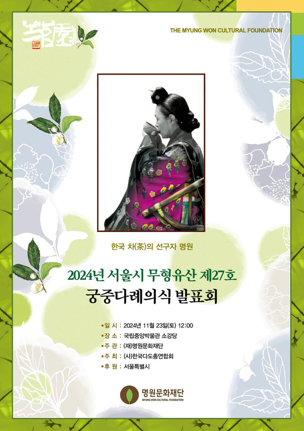 궁중다례의식 김의정 보유자는 1960년 대부터 우리나라 차 관련 학술대회와 전통다례발표회를 통해 궁중다례의식을 선보이고 있다. 이번 행사에서는 상다상궁으로서 왕에게 올릴 차를 준비하는 역할을 시연한다.
