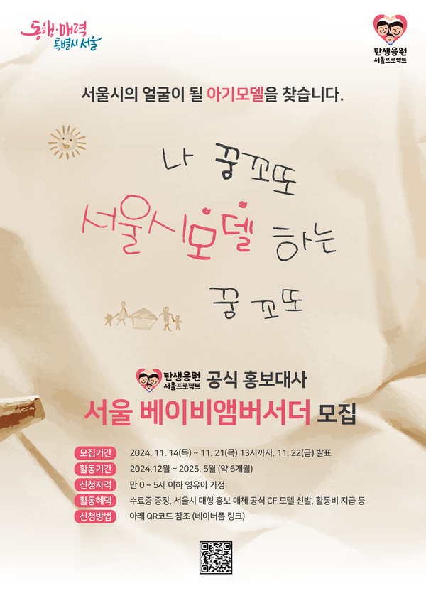 [서울시티=선정진 기자] 저출생 위기 극복을 위한 「탄생응원 서울 프로젝트」 추진에 총력을 기울이고 있는 서울시가 「탄생응원 서울 프로젝트」의 얼굴이 될 아기모델 ‘서울베이비앰버서더’(baby ambassador)를 찾는다.