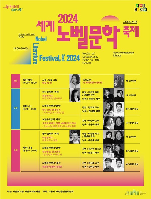 [서울시티=선정진 기자] 서울시는 한강 작가의 노벨문학상 시상일인 12.10.(화) 서울도서관에서 <2024 세계노벨문학축제>를 개최한다고 밝혔다. 이번 행사는 대한민국 최초의 노벨문학상 수상을 축하하고 기념하는 자리로 책을 사랑하는 모든 시민이 ‘축제’처럼 즐길 수 있도록 기획했다. 오후 2시부터 8시까지, 총 3부에 걸쳐 진행된다.