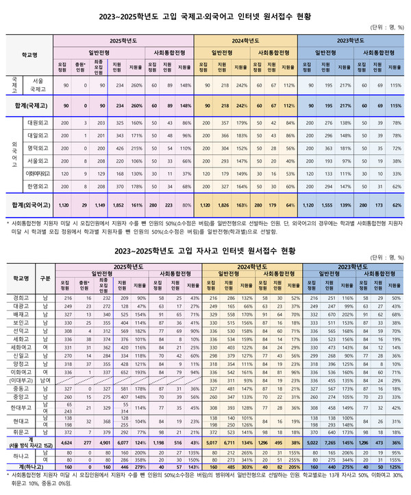 국제고‧외국어고‧자사고 주요 입학전형 일정은 다음과 같다.] 서울특별시교육청(교육감 정근식)은 12월 4일(수)부터 12월 6일(금)까지 모집한 2025학년도 국제고‧외국어고‧자율형 사립고(이하 ‘자사고’) 자기주도학습전형 원서접수 현황을 발표했다.