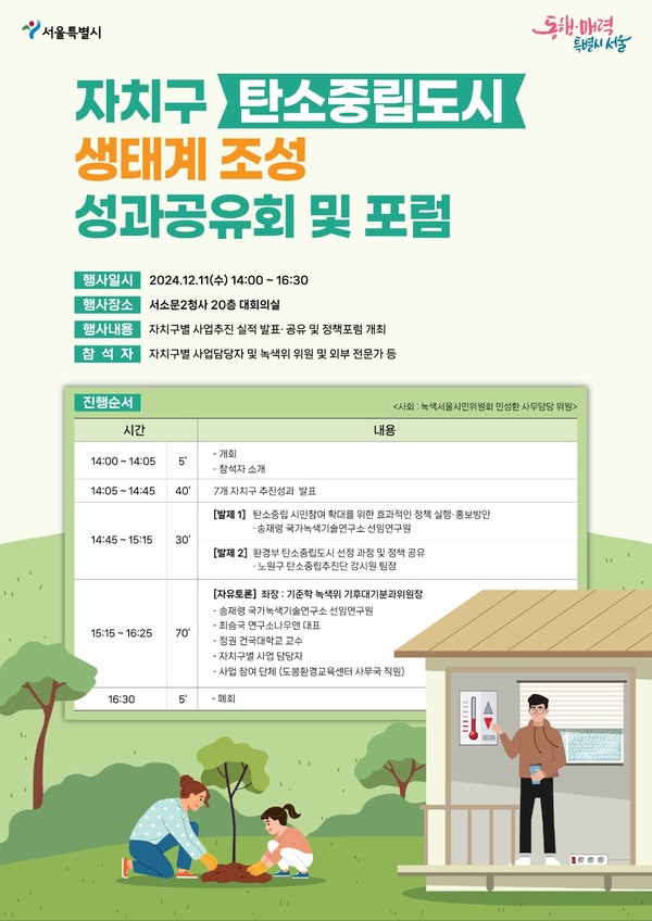 [서울시티=선정진 기자] 서울시는 2024년 한 해 동안 자치구·시민과 함께 ‘자치구 탄소중립도시 생태계 조성’을 위해 추진해 온 탄소중립 실천문화 활동 성과를 공유하고 탄소중립도시로 나아가기 위한 과제를 돌아보는 포럼을 11일(수) 서울시청 서소문2청사 대회의실에서 마련했다.