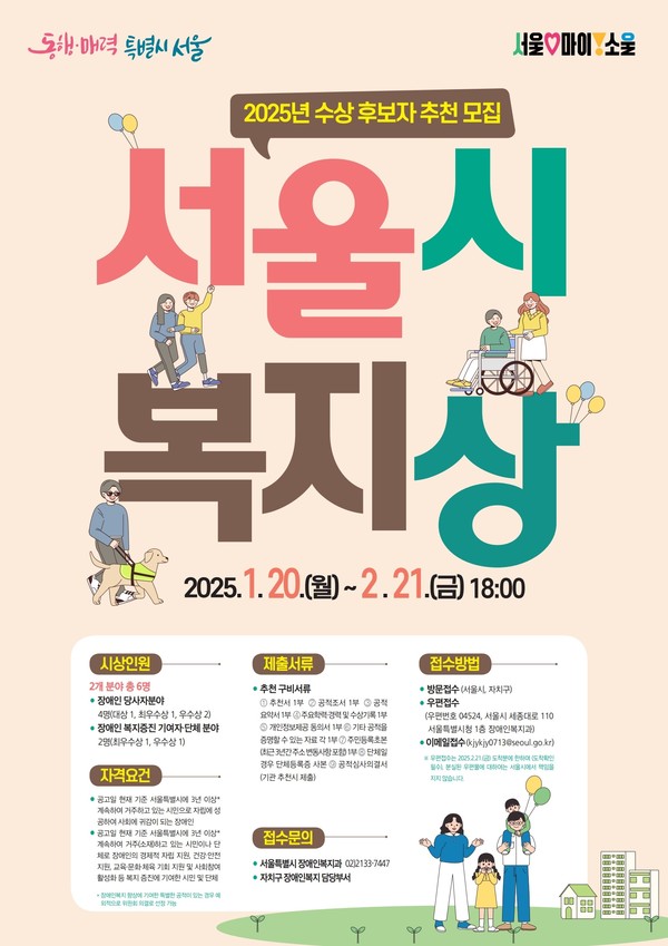 오는 2월 21일(금)까지 후보자를 모집하는 ‘서울시 복지상(장애인 분야)’은 ▲장애인 당사자 ▲ 장애인 복지증진 기여자 및 단체 2개 분야로 나누어 총 6명(대상 1명, 최우수상 2명, 우수상 3명)의 수상자를 선정한다.