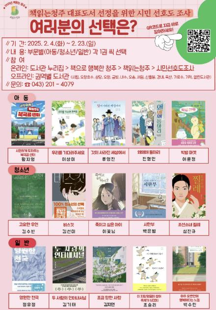 [서울시티 김청월 기자] 청주시립도서관은 2025년 책읽는청주 대표도서 선정을 위한 시민선호도 조사를 오는 4일부터 23일까지 진행한다.
