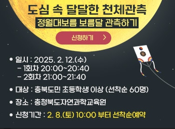 [서울시티 김청월 기자] 충청북도교육청 직속기관 자연과학교육원은 12일 저녁 20시부터 총 2회에 걸쳐 정월대보름을 맞이하여 충북 도민 및 학생 100명을 대상으로 '도심 속 달달한 천체관측'를 운영한다.